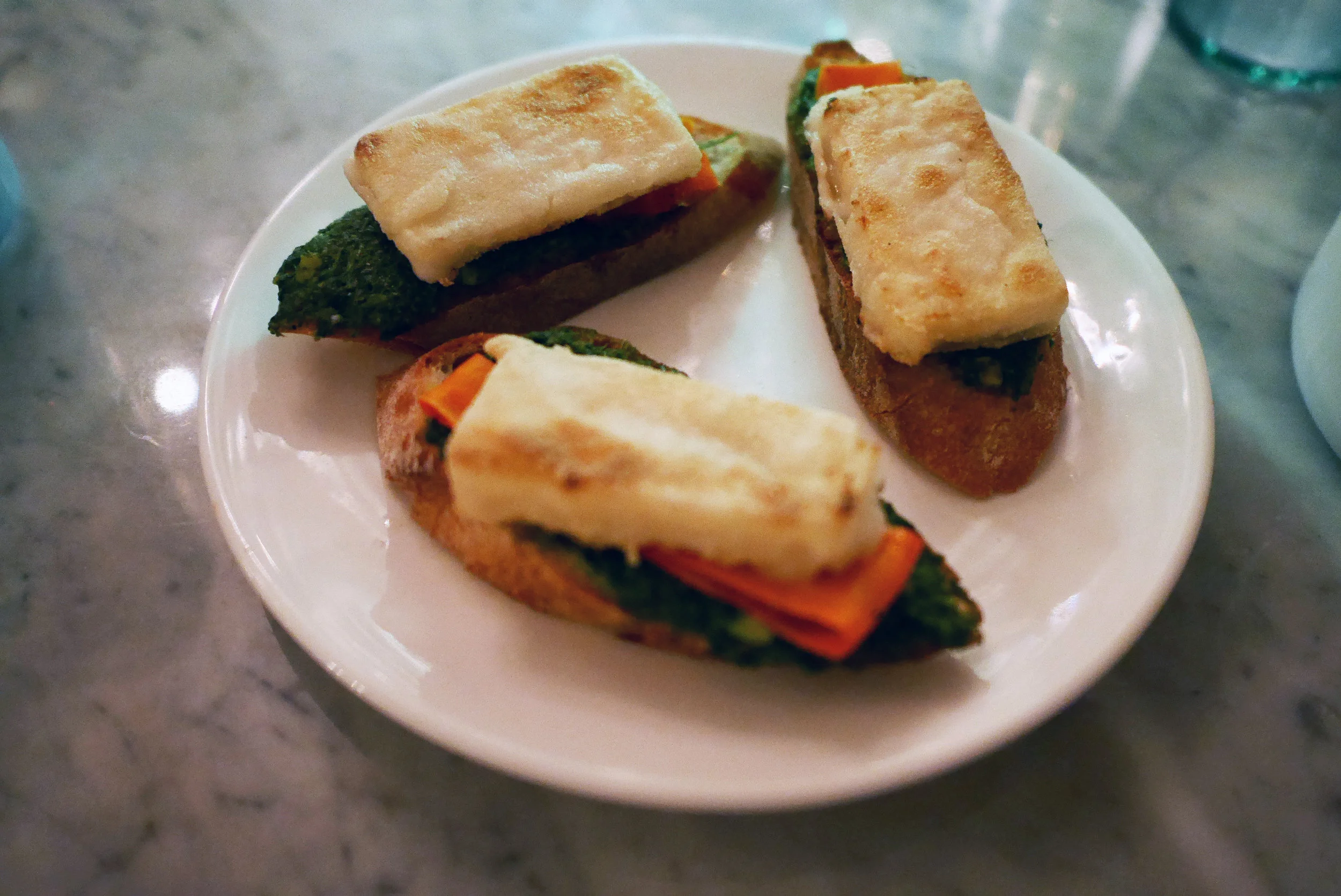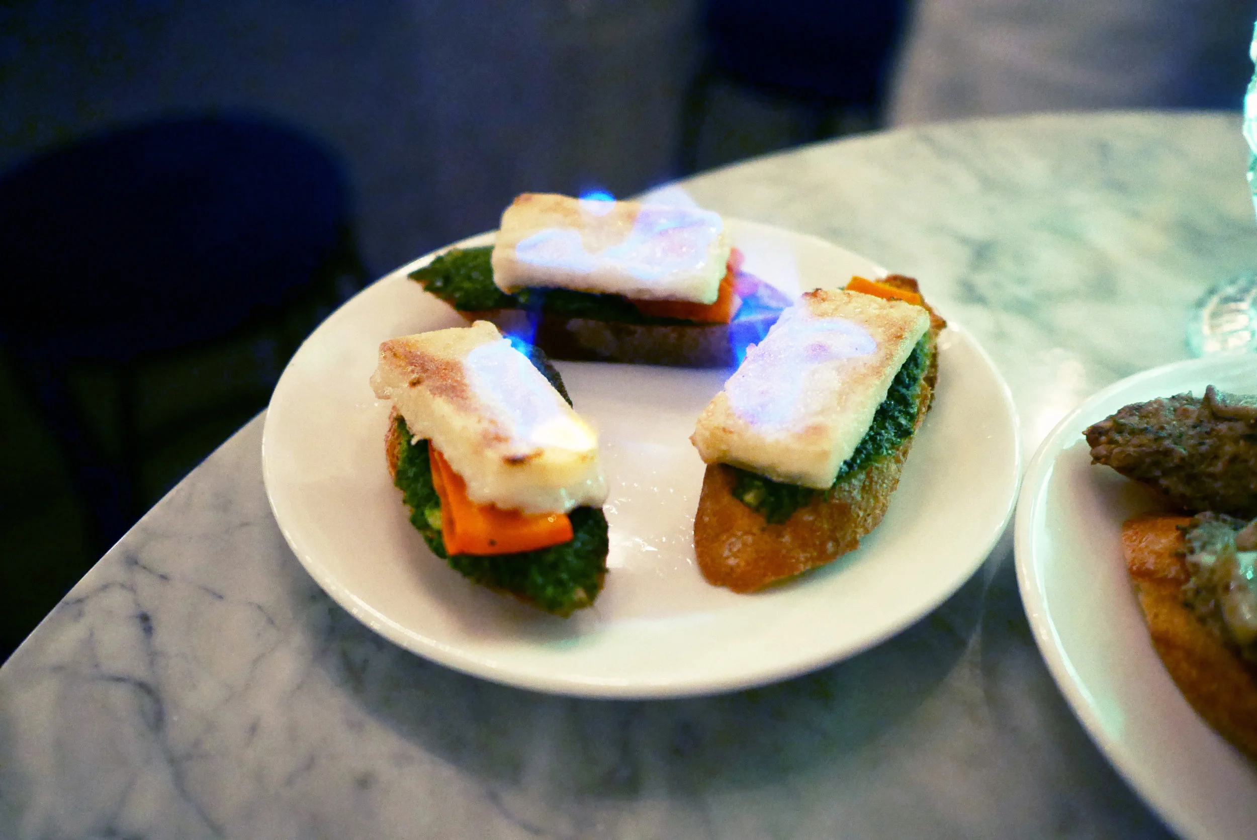 Saganaki - Flaming Soy Mozzarella, Smoked Carrot, Wild Arugula Pesto