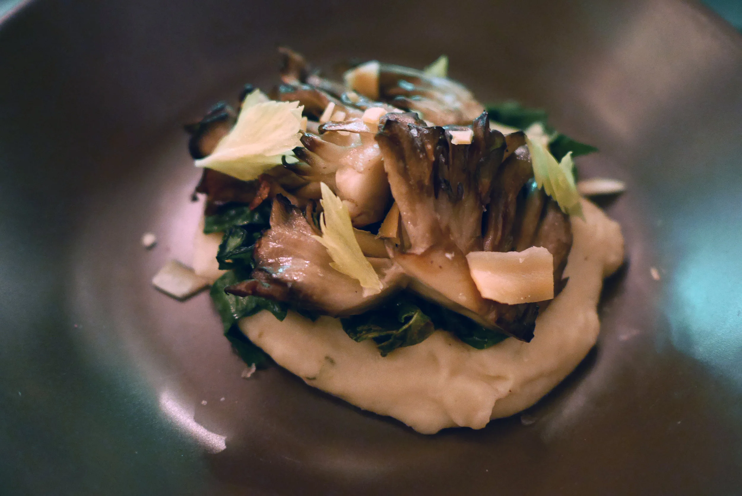King Trumpet & Oyster Mushroom - Wild Arugula Pesto, Oyster Leaf, Saffron Mignonette